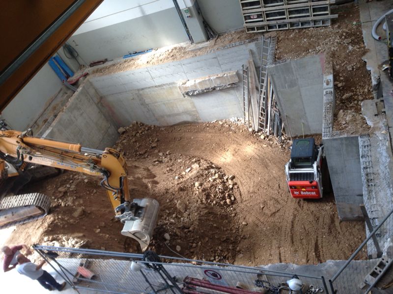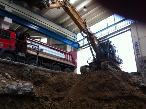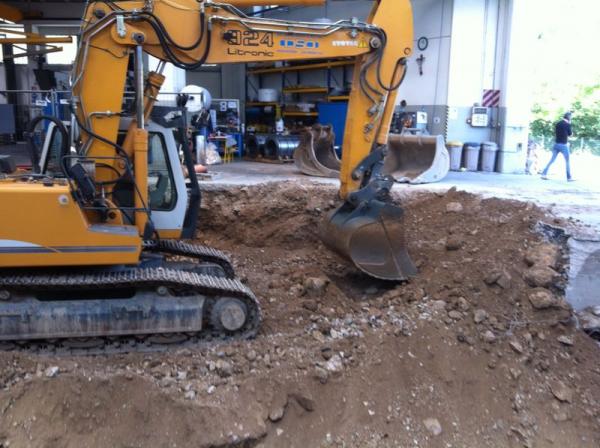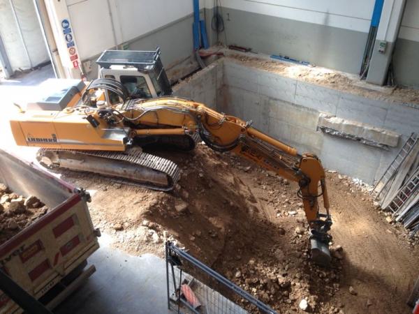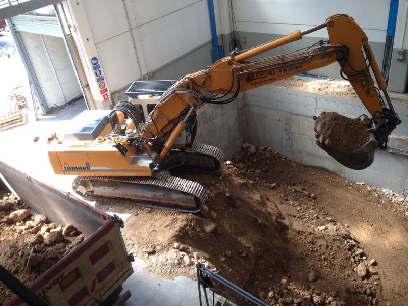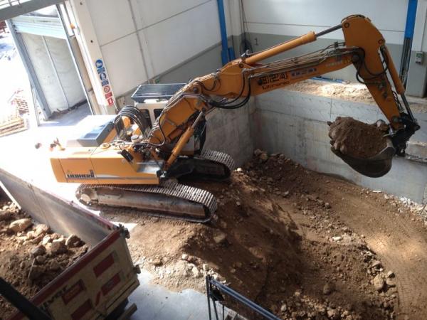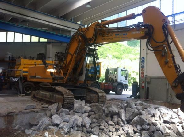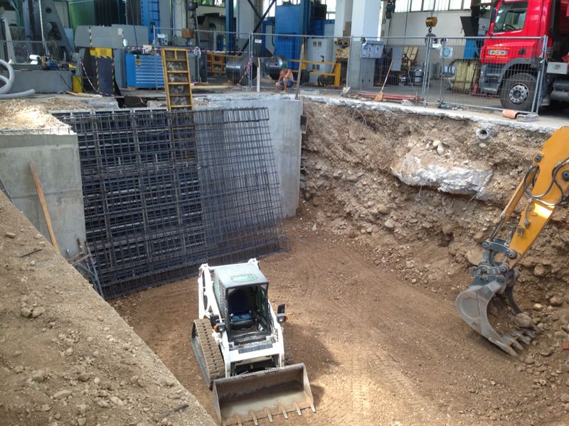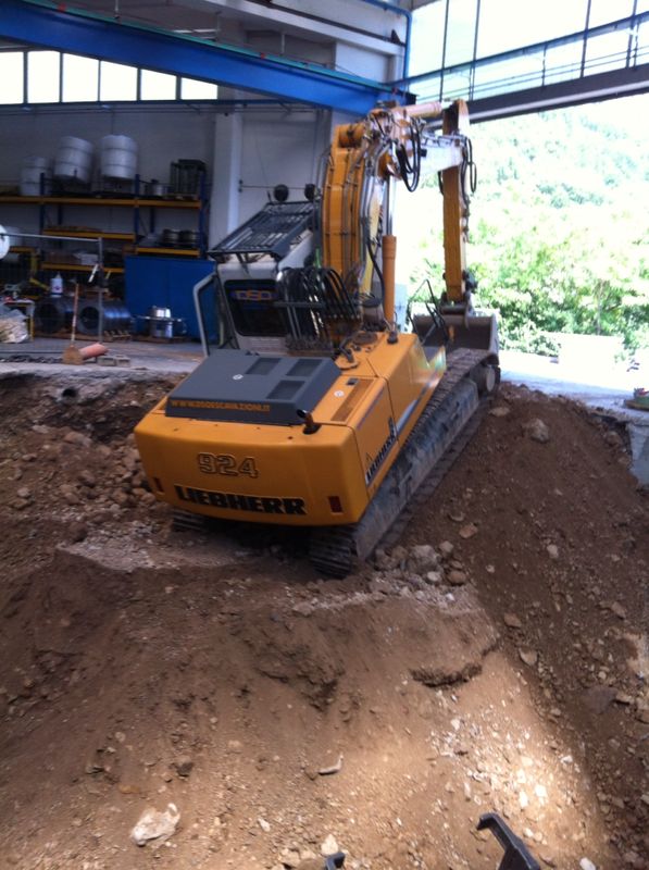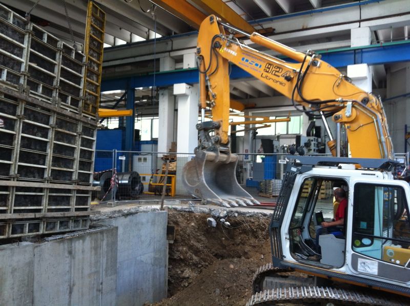 La particolarità della nuova macchina, ha avuto numerose fasi nell’esecuzione degli scavi e demolizioni per la costruzione delle fondazioni e muri di sostegno.Sono stati eseguiti; Demolizioni di pavimenti industriali, fondazioni di vecchi muri, e parte dei plinti di sostegno del fabbricato.Scavi a sezione obbligata tipo sottomurazione  dei plinti del fabbricato e delle  macchine utensili siti adiacenti agli scavi.Scavi eseguiti in varie fasi, sia per dar proseguimento alle lavorazioni dell’officina Dal Zotto, sia per il reinterro dietro i muri di sostegno tramite escavatore munito di benna rovescia con materiale direttamente scavato nel sito.