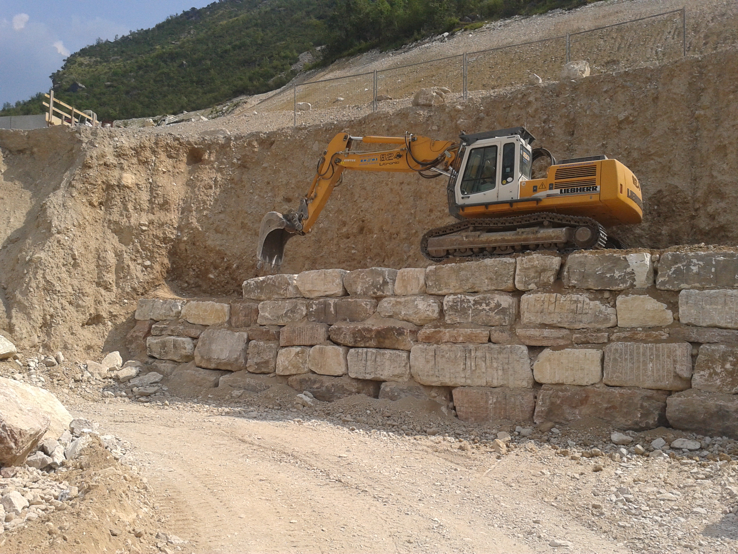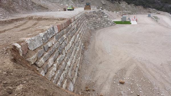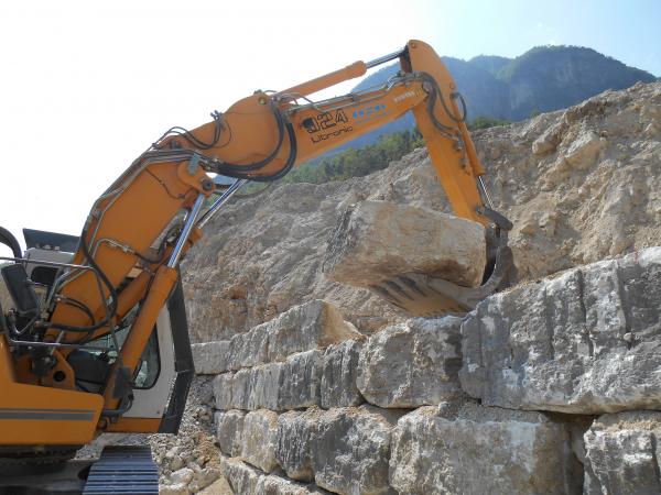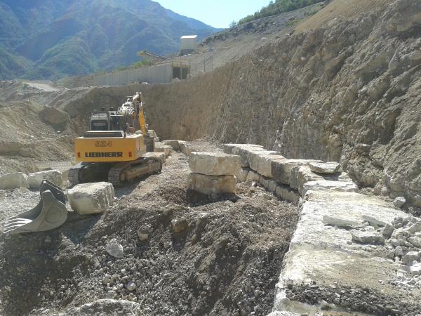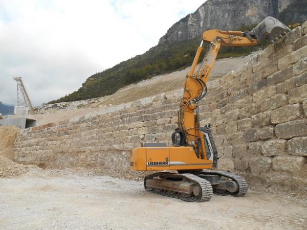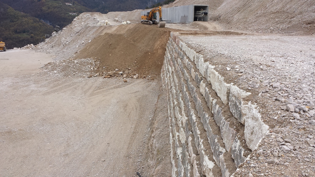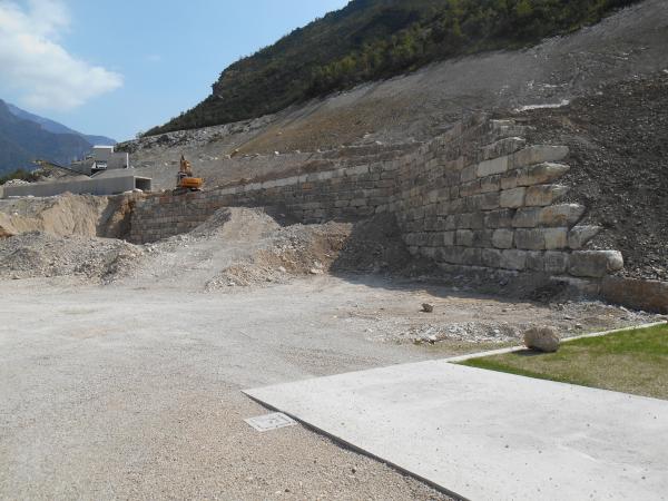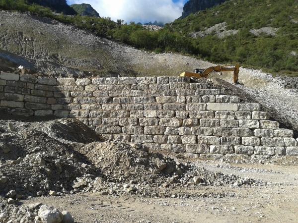CARICATI NELLA CAVA MOLINO E TRASPORTATI NEL NUOVO SITO IN CAVA MAROGNE PER DAR FORMA  AD UN NUOVO MURO DI SOSTEGNO IMPIANTI E STOCCAGGIO MATERIALI INERTI, DALLE DIMENSIONI DI 65 MT. PIU’ UN ANGOLAZIONE VERSO L’ESTERNO DEL PIAZZALE DI ALTRI 25 MT. CON UN ‘ALTEZZA DI 9 MT DATA LA DUREZZA DELLA ROCCIA, E STATO CONVENUTO DI ESEGUIRE LA POSA DEI BLOCCHI DI FONDAZIONE A DUE LIVELLI, DANDO COSI LA FORMAZIONE DI UN MURO A FACCIA VISTA  APPOGGIATO SOPRA ALLA BANCATA DI ROCCIA DEMOLITA E RIFINITA SEMPRE A FACCIA VISTA,