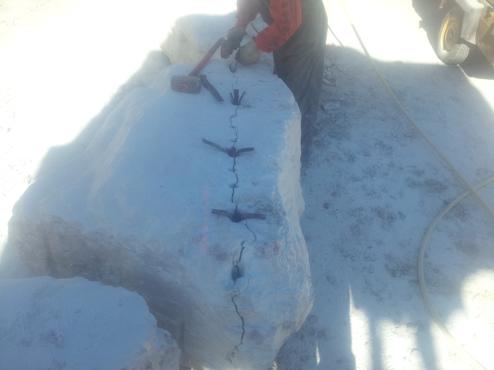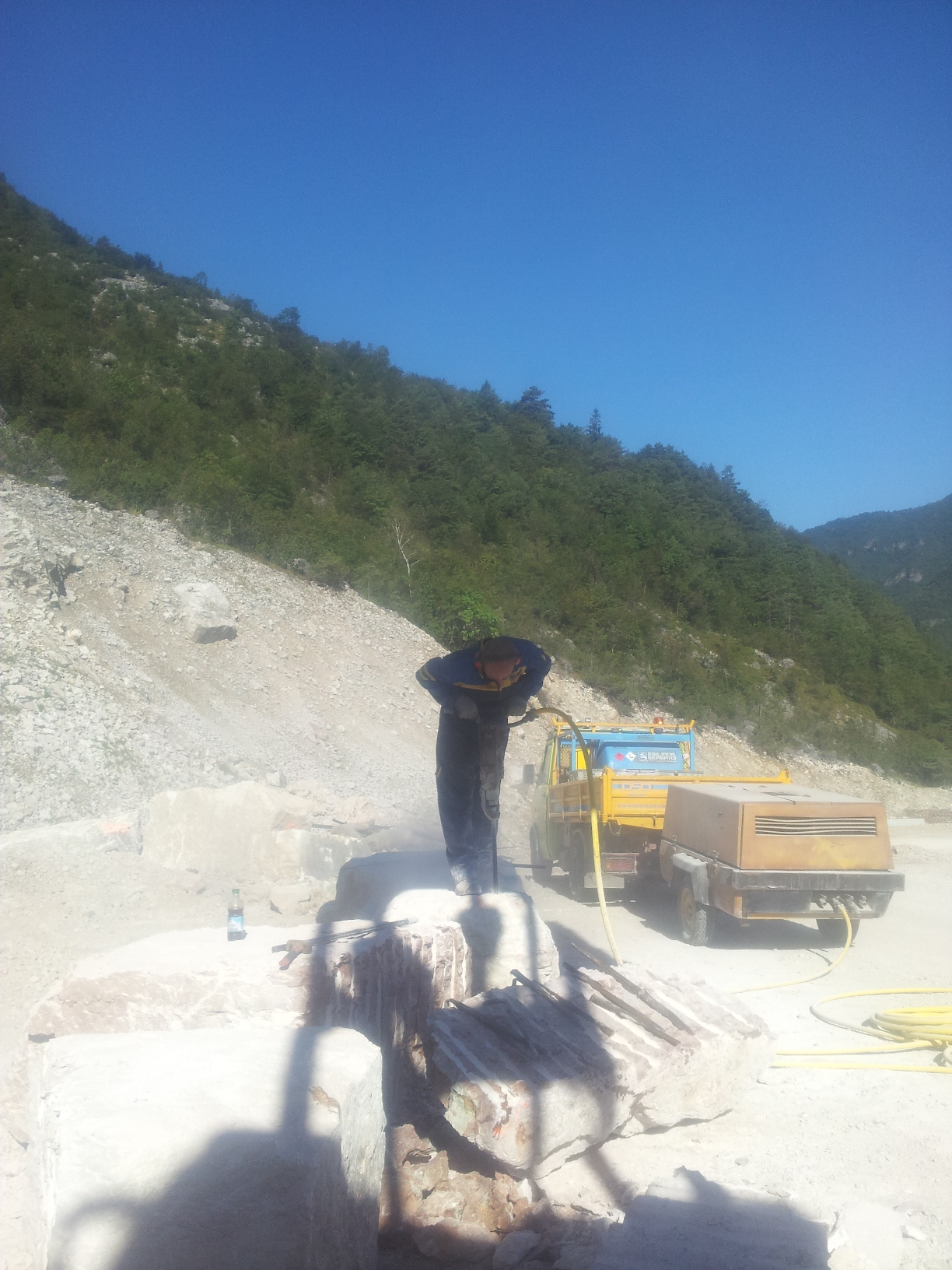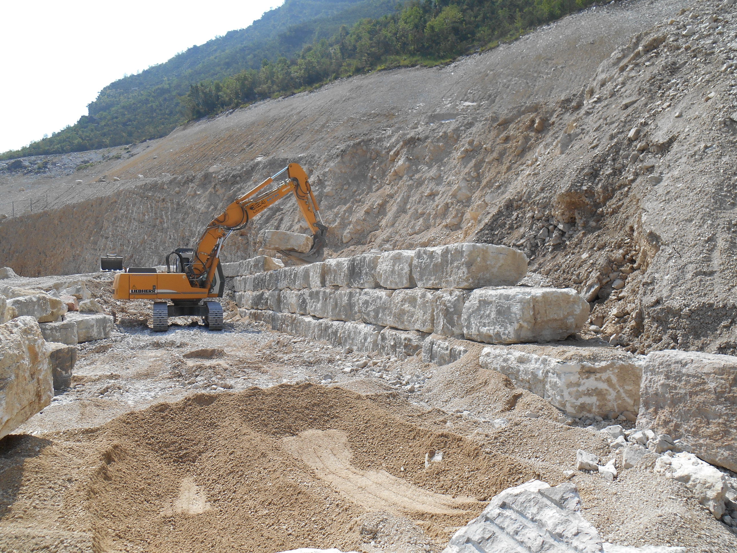 CARICATI NELLA CAVA MOLINO E TRASPORTATI NEL NUOVO SITO IN CAVA MAROGNE PER DAR FORMA  AD UN NUOVO MURO DI SOSTEGNO IMPIANTI E STOCCAGGIO MATERIALI INERTI, DALLE DIMENSIONI DI 65 MT. PIU’ UN ANGOLAZIONE VERSO L’ESTERNO DEL PIAZZALE DI ALTRI 25 MT. CON UN ‘ALTEZZA DI 9 MT DATA LA DUREZZA DELLA ROCCIA, E STATO CONVENUTO DI ESEGUIRE LA POSA DEI BLOCCHI DI FONDAZIONE A DUE LIVELLI, DANDO COSI LA FORMAZIONE DI UN MURO A FACCIA VISTA  APPOGGIATO SOPRA ALLA BANCATA DI ROCCIA DEMOLITA E RIFINITA SEMPRE A FACCIA VISTA,